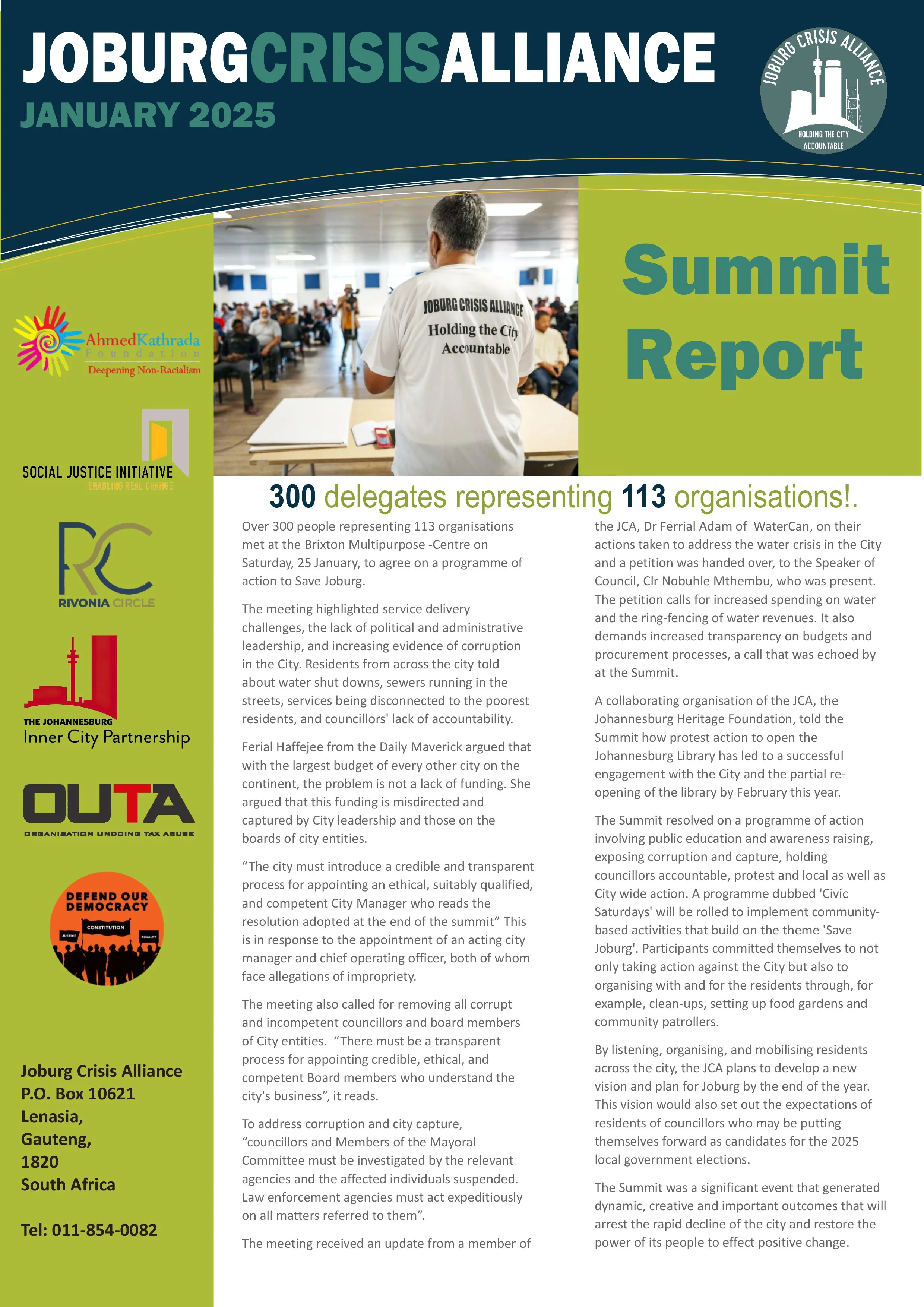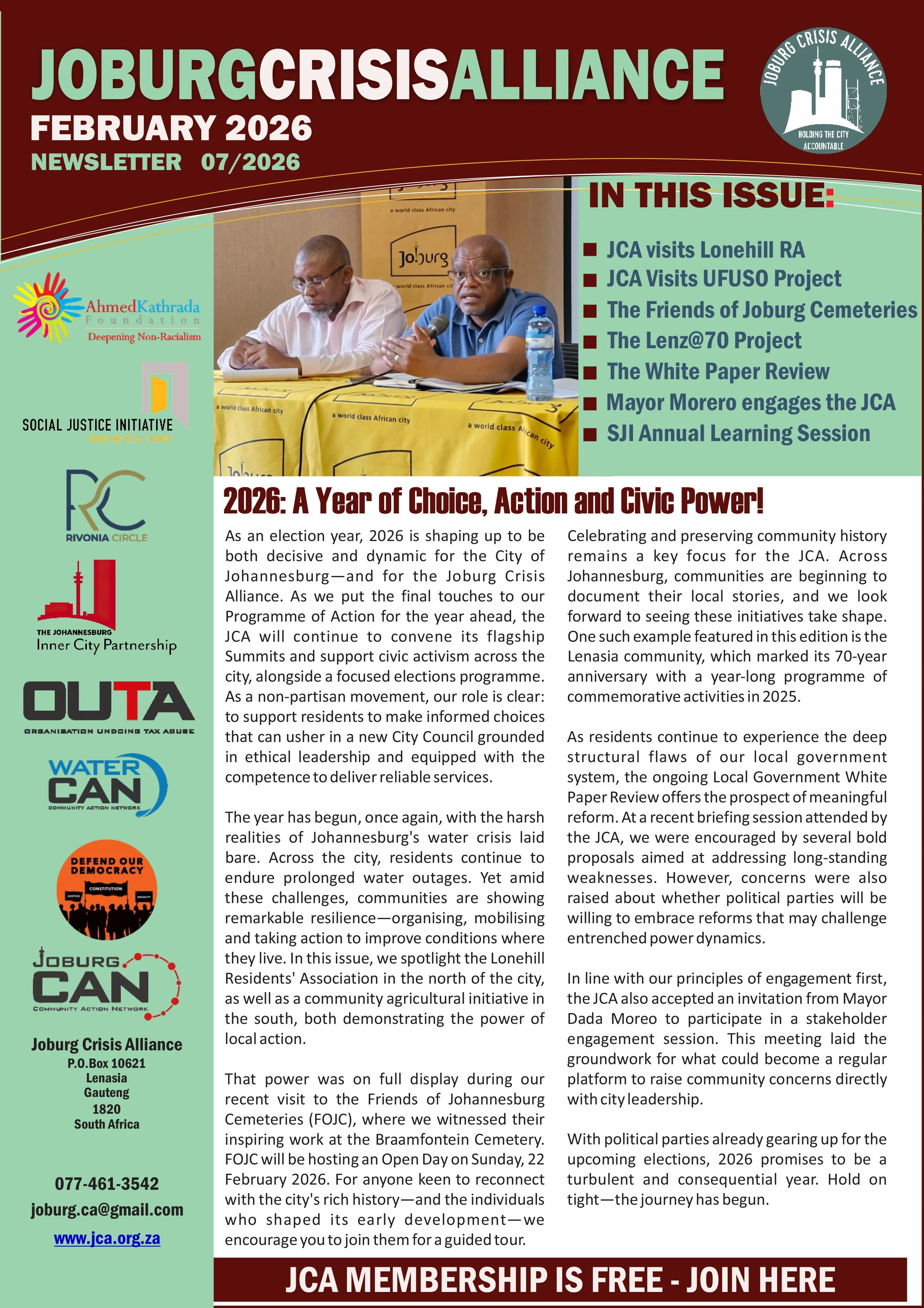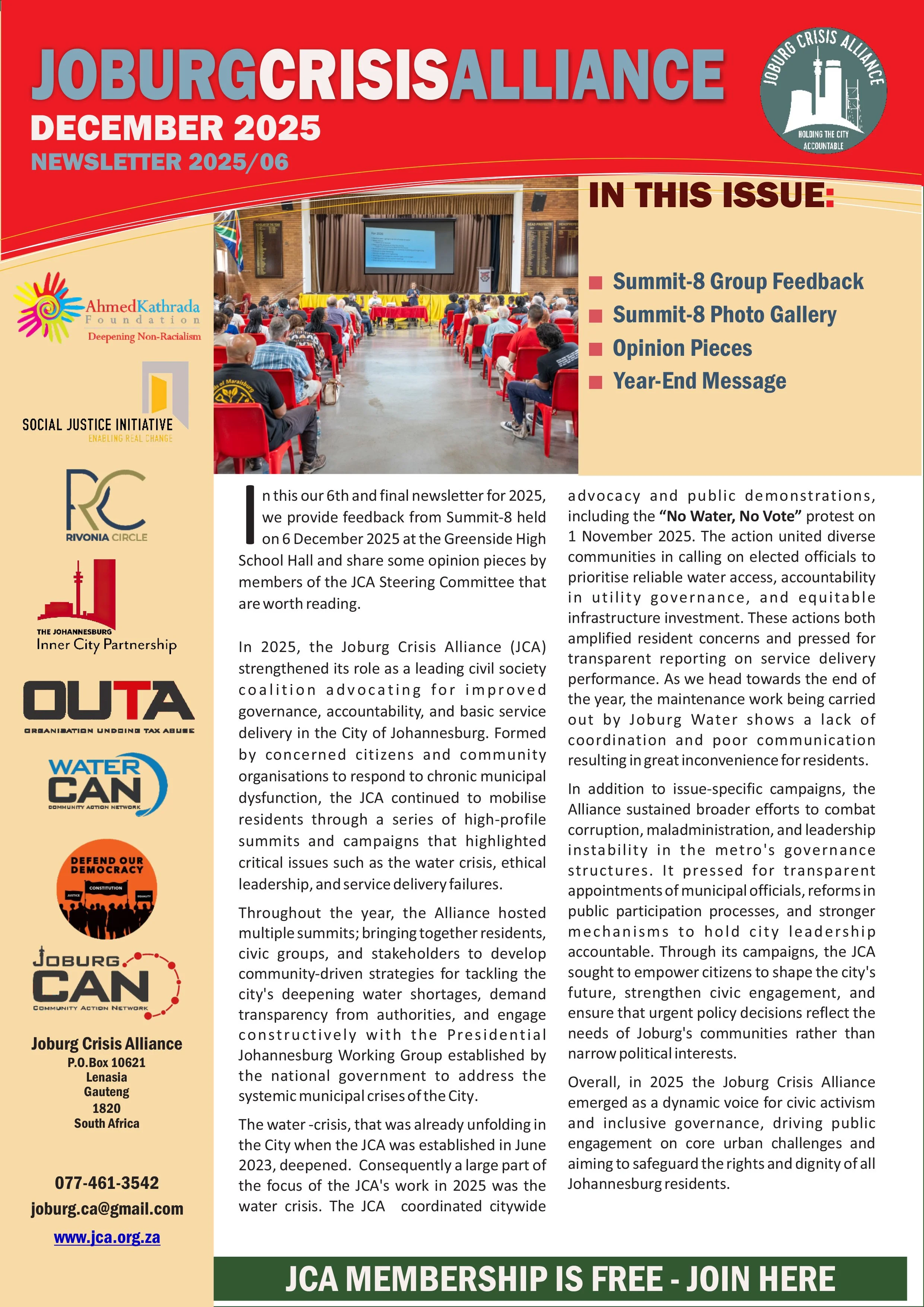 DocumentsKey Resources for a Better Joburg Newsletters February 2026 Download December 2025 Download November 2025 Download September 2025 download June 2025 download May 2025 Download January 2025 Download Opinion Pieces Opinion Piece byDave LewisBusiness Day - Nov 2025Read it here → Opinion Piece byPhumla WilliamsSunday Times - Oct 2025Read it here → Opinion Piece byLisa SeftelSunday Times - Aug 2025Read it here → Summit Documents Summit-9 ResolutionsMarch 2026Download → Summit-6 ReportMay 2025Download → Summit-8 - Documents PackDecember 2025Download → JCA StrategyApril 2024Download → WaterCAN PresentationApril 2024Download → Submissions Local Government White Paper Review Presentations16 January 2026Download → Letter to the President(By the Water Forum)10 Feb 2026Download→ JCA submission on the Local Government White Paper ReviewJune 2025Download → Water Crisis DemandsOctober 2025Download → JCA Presentation to the PresidentFebruary 2025Download → JCA proposals on Snr appointment, and Board reforms in CoJAug 2025Download → Miscellaneous Documents JCA notes from the 48th Extraordinary Council Meeting of the CoJMarch 2026Download → Reclaiming People’s Power Through Electoral ReformsPublished December 2024Download → Individual Endorsements to President 13 Feb 2026Download → JCA notes from the Special Council of the CoJ12 March 2026Download → Local Government White Paper Review Presentations16 January 2026Download → JCA Video Clip (7mins) AT AKF BANQUET NOV 2025View→ Civic Saturdays - Concept Documents for inputsMay 2025Download → Overview of the JCAApril 2024Download →