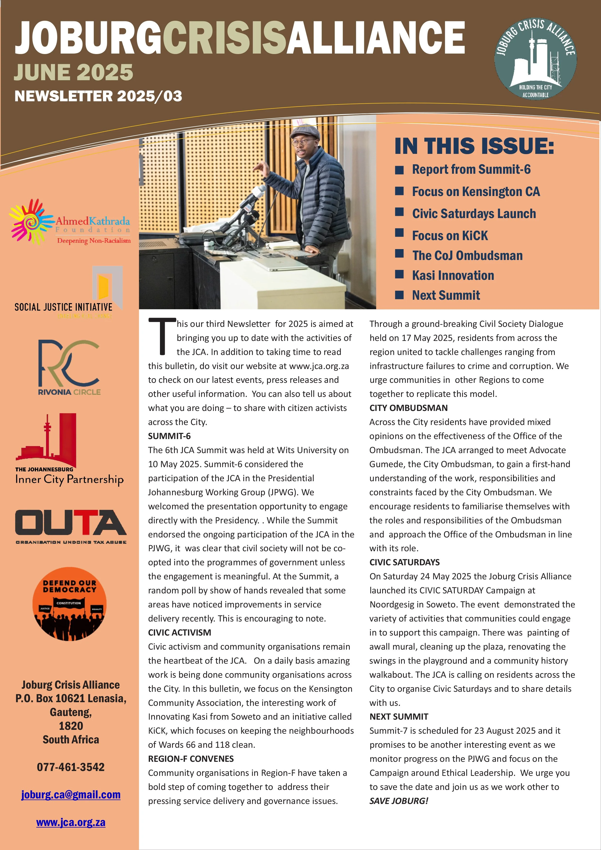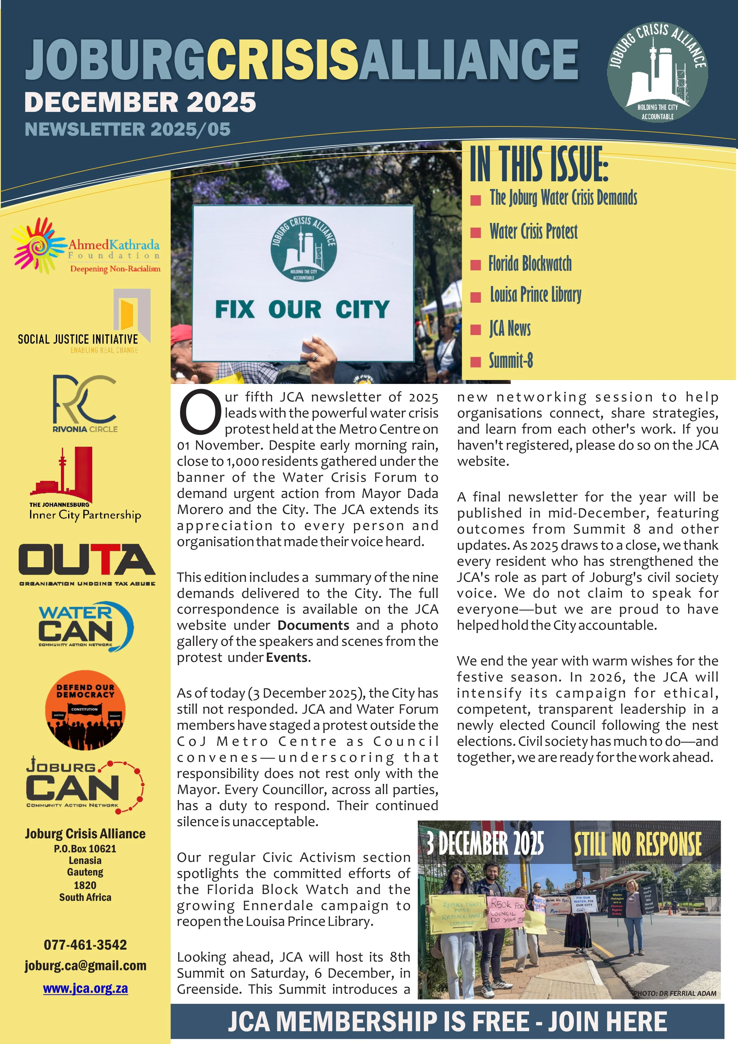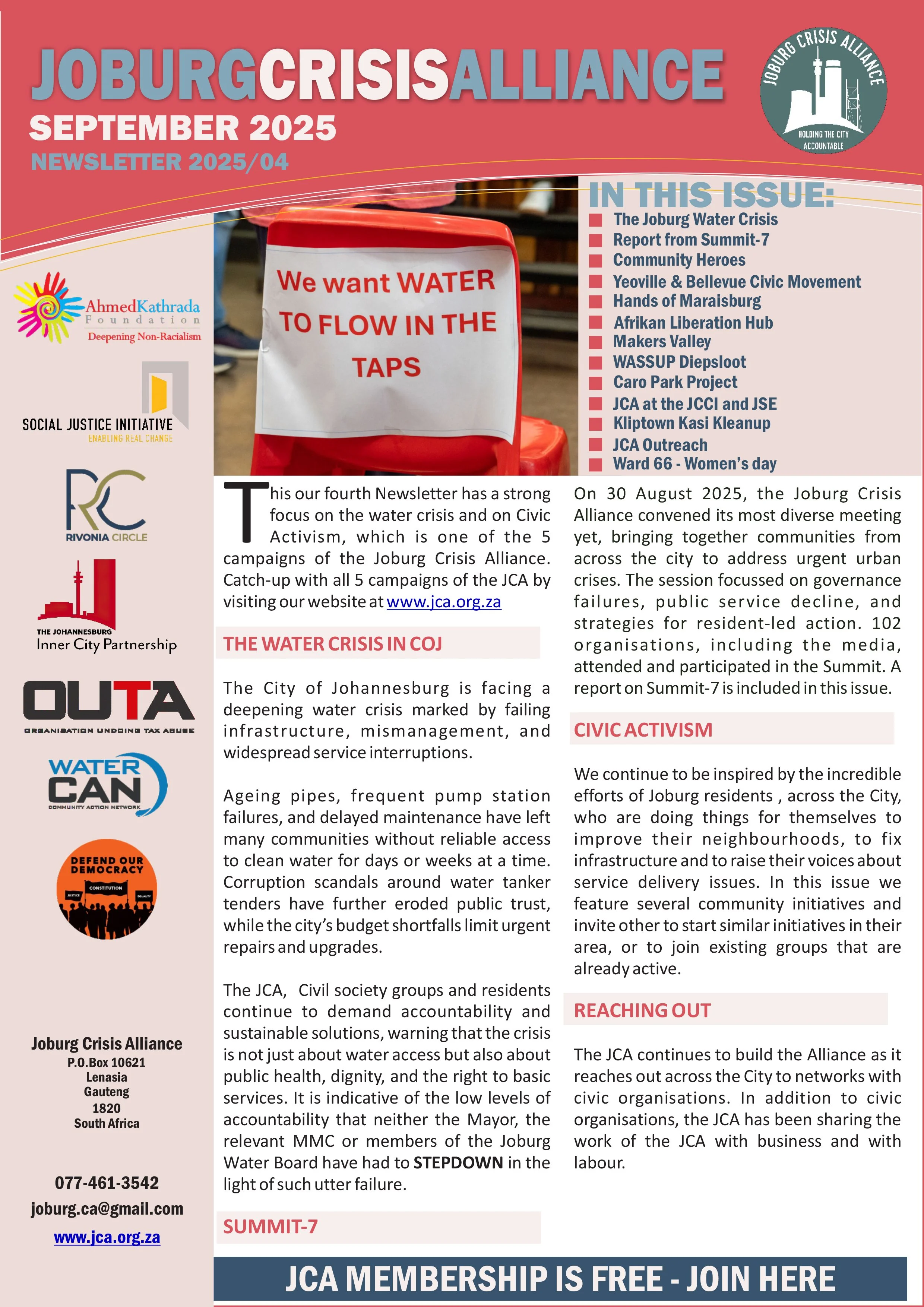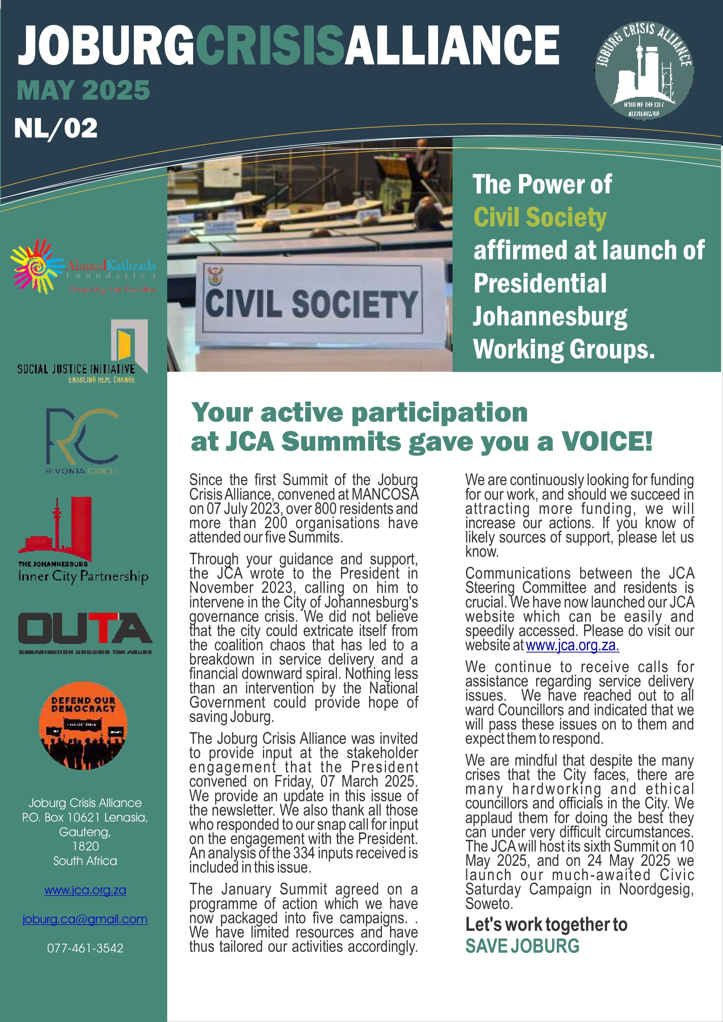 DocumentsKey Resources for a Better Joburg Newsletters February 2026 Download December 2025 Download November 2025 Download September 2025 download June 2025 download May 2025 Download January 2025 Download Opinion Pieces Opinion Piece byDave LewisBusiness Day - Nov 2025Read it here → Opinion Piece byPhumla WilliamsSunday Times - Oct 2025Read it here → Opinion Piece byLisa SeftelSunday Times - Aug 2025Read it here → Summit Documents Summit-9 ResolutionsMarch 2026Download → Summit-6 ReportMay 2025Download → Summit-8 - Documents PackDecember 2025Download → JCA StrategyApril 2024Download → WaterCAN PresentationApril 2024Download → Submissions Local Government White Paper Review Presentations16 January 2026Download → Letter to the President(By the Water Forum)10 Feb 2026Download→ JCA submission on the Local Government White Paper ReviewJune 2025Download → Water Crisis DemandsOctober 2025Download → JCA Presentation to the PresidentFebruary 2025Download → JCA proposals on Snr appointment, and Board reforms in CoJAug 2025Download → Miscellaneous Documents JCA notes from the 48th Extraordinary Council Meeting of the CoJMarch 2026Download → Reclaiming People’s Power Through Electoral ReformsPublished December 2024Download → Individual Endorsements to President 13 Feb 2026Download → JCA notes from the Special Council of the CoJ12 March 2026Download → Local Government White Paper Review Presentations16 January 2026Download → JCA Video Clip (7mins) AT AKF BANQUET NOV 2025View→ Civic Saturdays - Concept Documents for inputsMay 2025Download → Overview of the JCAApril 2024Download →