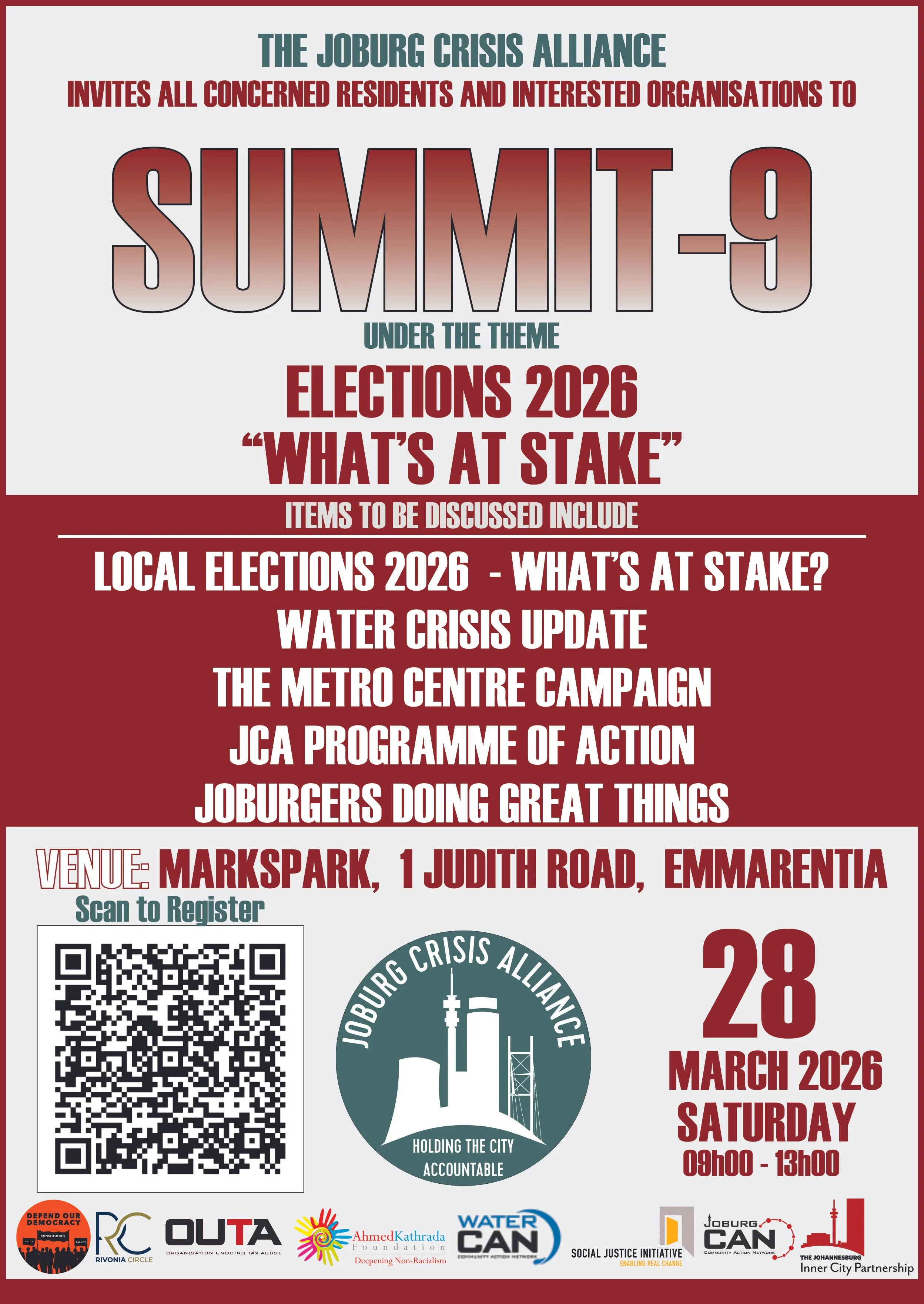 Summit to confirm our programme of action for 2026 as we head into an exciting and defining election year. Venue: Markspark, Emmarentia.